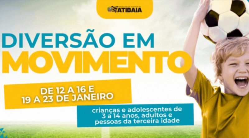 O festival “Diversão em Movimento” será realizado de 12 a 16 e de 19 a 23 de janeiro e oferecerá diversas atividades recreativas e esportivas aos participantes, todas gratuitas. A programação acontecerá em quatro locais: Complexo Santa Clara, Conjunto Esportivo do Elefantão, Atibaia Jardim e Balneário, das 13h às 17h. Para participar, os interessados deverão se dirigir nas datas, horários e locais do evento e realizar a inscrição com os monitores.