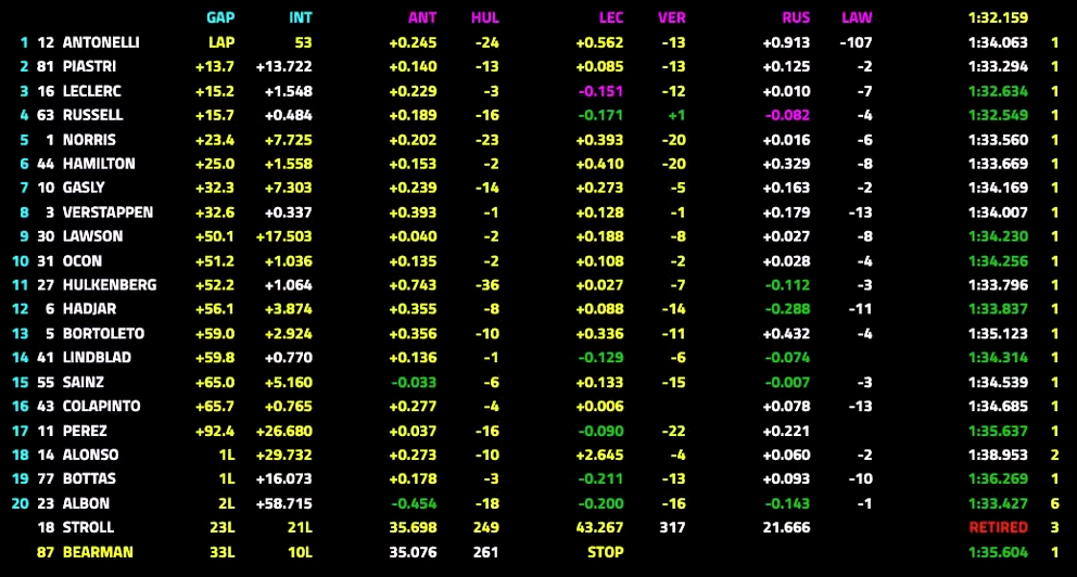 Desde a classificação, as McLarens mostraram que poderiam se envolver na disputa, ao menos nessa etapa, trazendo uma expectativa maior de disputas na pista. Com isso, a corrida começou intensa, as Ferraris atacaram, os motores Mercedes se mostraram constantes e em tempo real tudo se desenhava: pneus, ritmo e controle de energia. Antonelli, porém, correu como percebesse a pressão. Encontrou espaços, ditou o ritmo e atacou com precisão. Soube aproveitar o Safety Car para vencer. Mas não apenas isso, soube ler a prova como um todo.