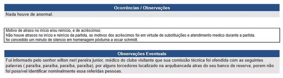 O clube ainda apontou que os atos teriam partido de torcedores da equipe adversária e cobrou que os responsáveis sejam identificados e punidos. O árbitro relatou na súmula também o caso.